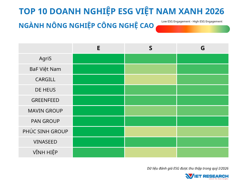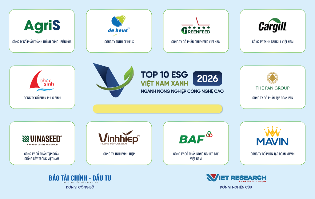 Trong khuôn khổ Chương trình Nghiên cứu và vinh danh về việc cam kết và thực hiện ESG trong các ngành kinh tế chủ lực năm 2026, Viet Research phối hợp với Báo Tài chính – Đầu tư (Bộ Tài chính) công bố Top 10 Doanh nghiệp ESG Việt Nam Xanh 2026 – Ngành Nông nghiệp công nghệ cao. Đây là những doanh nghiệp thuộc lĩnh vực nông nghiệp công nghệ cao tiên phong trong việc đưa ra các cam kết thực hiện mục tiêu ESG, phát triển bền vững. Bảng xếp hạng ESG10 ngành Nông nghiệp công nghệ cao được xem là một điểm khởi đầu quan trọng cho hành trình chuyển đổi của cộng đồng doanh nghiệp Việt Nam hướng tới phát triển bền vững, đóng góp vào mục tiêu phát triển kinh tế – xã hội của đất nước và hội nhập sâu rộng với nền kinh tế toàn cầu.