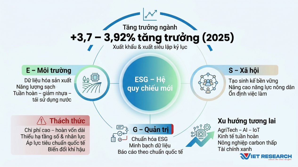 Từ kết quả khảo sát doanh nghiệp, Viet Research nhận định, trong giai đoạn tới, ESG được dự báo sẽ trở thành “tấm vé” thông hành để nông nghiệp Việt Nam thoát khỏi phân khúc giá rẻ và vươn tới chuỗi giá trị cao cấp. Công nghệ, tự động hóa, kinh tế tuần hoàn, minh bạch dữ liệu và tài chính xanh sẽ là những xu hướng chính quyết định năng lực cạnh tranh của doanh nghiệp, mở ra cơ hội nâng tầm giá trị và phát triển bền vững hơn trong dài hạn.